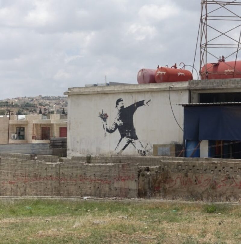 Love Is in the Air originates from an original mural created in 2003 by Banksy on the wall in Bethlehem near the Israeli West Bank barrier. It depicts a masked protester throwing a bouquet of flowers instead of a weapon, symbolising the power of peace and non-violent resistance.